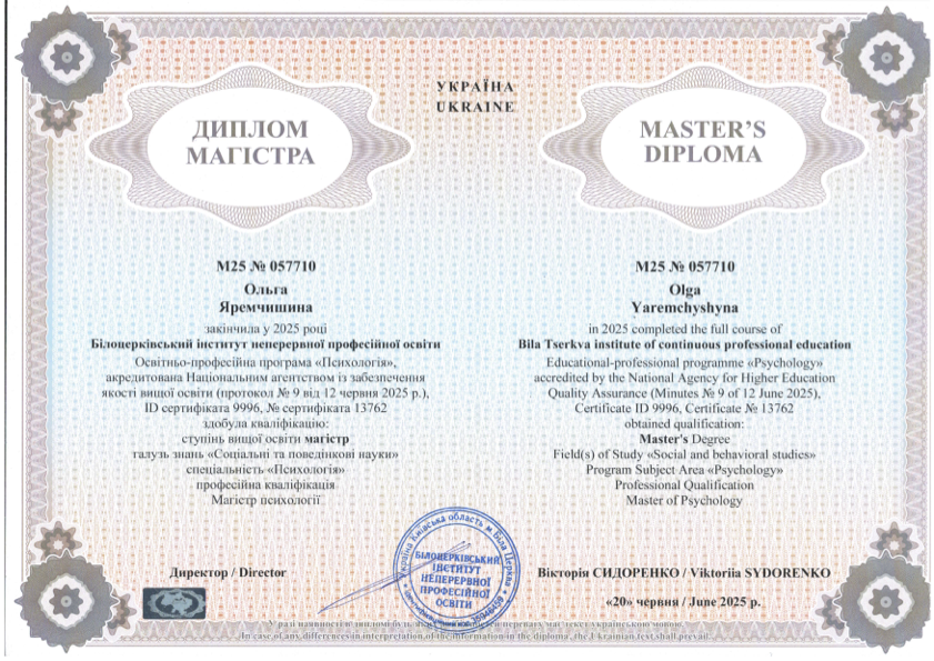 Мій шлях у психології почався з особистої психотерапії — у пошуках відповідей на запитання: як знайти своє місце у житті, налагодити стосунки у родині, зберігати баланс між роботою та сім’єю.